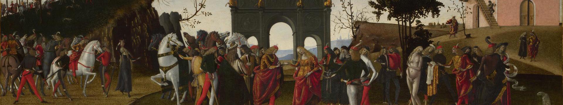 Raphael moved to Florence in around 1504. The city was bustling with ambitious painters and sculptors who explored nature, mathematical perspective and classical sculpture. Leonardo da Vinci’s paintings and Michelangelo’s sculptures had a profound impact on Raphael’s understanding of the human figure. His works quickly became more ambitious. He painted altarpieces, portraits and paintings for private devotion. They were celebrated for their unrivalled harmony of colour, airy landscapes and gracious figures. Raphael’s meteoric rise made him one of the most sought-after painters in Florence. Only a few years later, Pope Julius II called him to Rome to work for the papal court.